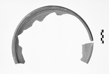 | Description: | Five rim fragments, four joining, giving greater part of rim and upper wall; base missing. Overhanging rim, shallow rounded bowl. No decoration. Thin, hard-fired dull purplish-red ware and slip; outside of rim unevenly discolored (gray, etc.) Hayes form 3C/E. Phocean red slip ware. | |