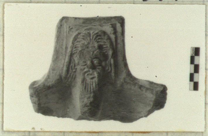 | Description: | Near-complete lug (chipped around edges), with part of rim. Rim profile: rim with sloping flange and a lower moulding bearing imprint of rim of the missing cylindrical stand (W. 0.11) or three large 'dentils' in relief. Lower rim-moulding notched, main flange bears a row of large double-outline egg motifs, impressed. A squarish lug on top of rim and flange, tilted obliquely; moulded front, relief Π-shaped edge (grooved) on back. Front of lug: relief satyr mask, with beard forming top of a solid sloping lug on interior of vessel; mask has arched outline set on a square relief panel, with 'K' and 'Ξ' in relief at top corners. Coarse gritty red ware, fired yellowish to gray at surface. Local? Import? Residual in early Roman context. | |