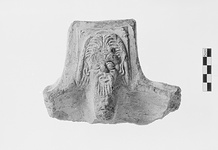| Description: | Near-complete lug (chipped around edges), with part of rim. Rim profile: rim with sloping flange and a lower moulding bearing imprint of rim of the missing cylindrical stand (W. 0.11) or three large 'dentils' in relief. Lower rim-moulding notched, main flange bears a row of large double-outline egg motifs, impressed. A squarish lug on top of rim and flange, tilted obliquely; moulded front, relief Π-shaped edge (grooved) on back. Front of lug: relief satyr mask, with beard forming top of a solid sloping lug on interior of vessel; mask has arched outline set on a square relief panel, with 'K' and 'Ξ' in relief at top corners. Coarse gritty red ware, fired yellowish to gray at surface. Local? Import? Residual in early Roman context. | |