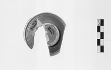 | Description: | Half of foot and floor, with bottom of wall (two joining pieces). Vertical wall with small flange at bottom, shallow floor, tiny foot ring. Fine striations on wall, fine groove around a tiny stamp on floor. Stamp: (small planta pedis). Italian Terra Sigillata. | |