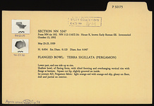 Description:   Lower part, and one side up to rim. Shallow bowl, of flaring form, with tilted foot ring and overhanging vertical rim with flange at bottom. Square cut lip, slightly grooved on inside.