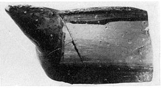 | Description: | Mended from five pieces; none of the lower part preserved. The flaring sides straighten toward the top; the rim is a simple thickening, projecting slightly on the outside. Blunt rounded spout, bridged by rim. Heavy fabric; pinkish buff clay. Reddish brown to black glaze on the inside, on the outside to just below the rim, and for a broad band around the body below the spout, and all over the spout. | |