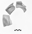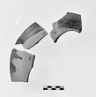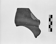 | Description: | Base, with profile to rim; three non-joining pieces of rim. Shallow body, conical on outside, high flaring rim/wall; heavy foot. Rim offset from floor on inside. Orange-brown clay. Partial glaze, brown, turning black at rim, flaking on inside. A metallic black 'tondo' on floor. Related to P 31925? | |