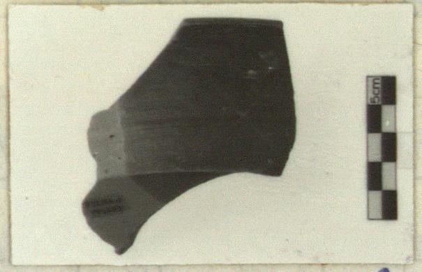 | Description: | Base, with profile to rim; three non-joining pieces of rim. Shallow body, conical on outside, high flaring rim/wall; heavy foot. Rim offset from floor on inside. Orange-brown clay. Partial glaze, brown, turning black at rim, flaking on inside. A metallic black 'tondo' on floor. Related to P 31925? | |