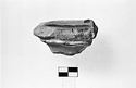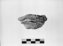 | Description: | Edge of floor of basin (or of shoulder of large closed form), with body angle. At the angle, stump of a thick round-sectioned foot or handle, with surrounding ring at junction with body. Buff clay with slight inclusions; patches of olive-green glaze on inside, worn remains of whitish to dark green-blue glaze on outside. Possibly Mesopotamian/Tarsus fabric. | |