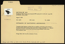 Description:   Triangular body fragment, perhaps from an amphora, preserving on the exterior a horizontal black band with thin white band near its edge and parallel to it. Adjacent reserved area carries a vertical black band preserving candidate's entire name.