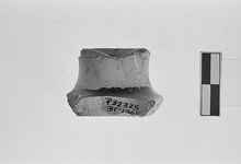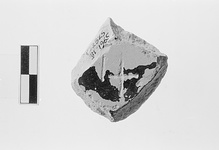 Description:   Fragment of a fine ware base or lid handle preserving traces of black glaze. Reserved band around base/handle? Flat surface opposite base/handle carries two letters.