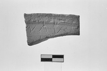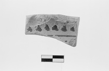 Description:   Rim fragment preserving thick rays of black paint on its top surface, and a series of rays or ivy leaves above a thin horizontal band on its exterior surface. Four letters and the remains of two others are preserved cut into the unglazed interior surface.