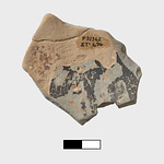 Broad and irregular sweep of paint on interior. Three horizontal bands on lower part of exterior (canonical decoration), above which is a broad sweep of paint (non-canonical). Paint on interior, thickly applied with a tendency to flake, fired black. Surface on interior light gray where paint has worn or flaked off. Paint on exterior fired light pinkish-red, but mostly worn (flaked; surface light gray where paint is not preserved).