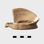 | Description: | Vessel broken during manufacture and subsequently reused as test piece. Five joining fragments preserving base and portion of lower body of closed vessel. Vessel clearly broken during manufacture on wheel. Disk base, pushed up on underside; lower wall rising steeply. Irregularly applied paint over part of lower wall and on underside. Paint fired reddish purple. Clay body and reserved surfaces evenly fired close to pink 5YR 7/3. Agora Sample no. 882. | |