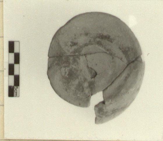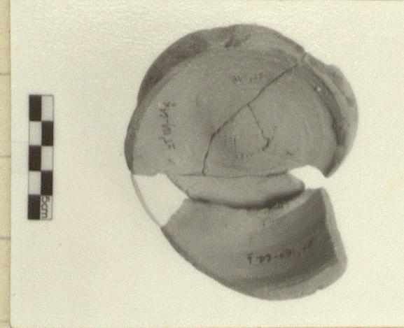 | Description: | Vessel broken during manufacture and subsequently reused as test piece. Five joining fragments preserving base and portion of lower body of closed vessel. Vessel clearly broken during manufacture on wheel. Disk base, pushed up on underside; lower wall rising steeply. Irregularly applied paint over part of lower wall and on underside. Paint fired reddish purple. Clay body and reserved surfaces evenly fired close to pink 5YR 7/3. Agora Sample no. 882. | |