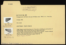 | Description: | Single fragment preserving large part of test piece, including top and portion of both side edges. Piece cut from the neck of a large closed vessel. Traces of paint, poorly preserved and mostly worn, on exterior. Interior evidently reserved. Paint on exterior fired red, as is that on top edge. Clay core and surfaces fired close to pink 7.5YR 7/4. | |