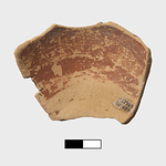 | Description: | Single fragment preserving portion of test piece, with no clear edges. Fragment, cut from lower body of small open vessel, preserves lower stump of handle attachment. Probably from a one-handled cup rather than a skyphos. Clay body and reserved surfaces fired close to pink 7.5YR 7/4. Exterior reserved; upper part of interior painted. Paint fired red. | |