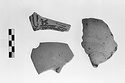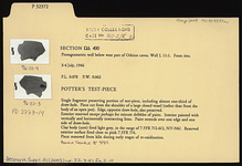 | Description: | Single fragment preserving portion of test piece, including almost one-third of draw hole. Piece cut from the shoulder of a large closed vessel (rather than from the body of an open pot). Edge, opposite draw hole, also preserved. Exterior reserved, except perhaps for minute dribbles of paint. Interior painted with vertically and horizontally intersecting lines. Paint extends over one edge and one side of draw hole. Clay core fired light gray, in the range of 7.5YR 7/2-6/2, N7/-N6/. Reserved exterior surface fired close to pink 7.5YR 7/4. Piece removed from kiln during early stages of re-oxidization. | |