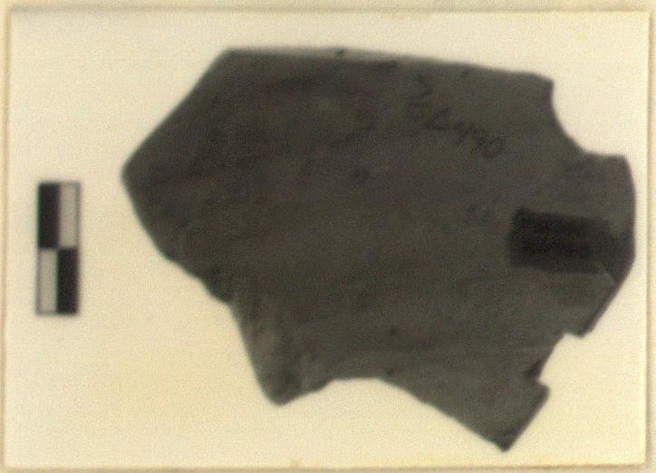 | Description: | Single fragment preserving portion of test piece, including almost one-third of draw hole. Piece cut from the shoulder of a large closed vessel (rather than from the body of an open pot). Edge, opposite draw hole, also preserved. Exterior reserved, except perhaps for minute dribbles of paint. Interior painted with vertically and horizontally intersecting lines. Paint extends over one edge and one side of draw hole. Clay core fired light gray, in the range of 7.5YR 7/2-6/2, N7/-N6/. Reserved exterior surface fired close to pink 7.5YR 7/4. Piece removed from kiln during early stages of re-oxidization. | |