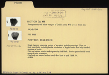 | Description: | Single fragment preserving portion of test piece, including one edge. Piece cut from lower body, including handle attachment, of skyphos rather than belly-handled amphora or hydria. Paint on interior, exterior and edge evenly fired black. Interior painted solidly; broad sweep of paint on exterior. Clay body and reserved surfaces evenly fired close to pink 7.5YR 7/4. | |