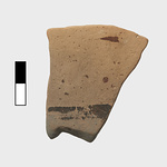 | Description: | Single fragment preserving portion of test piece, including one edge. Piece cut from body of large closed vessel. Paint on interior and exterior fired black. Portion of horizontal band on exterior. Vertically and horizontally intersecting lines on interior. The greater part of clay body fired close to light gray/gray 7.5YR N6/. Outer part of clay body, reserved surfaces and clay at edge fired close to pink and light brown 7.5YR 7/4-6/4. | |