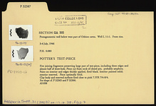 | Description: | Five joining fragments preserving large part of test piece, including three edges and almost half of draw hole. Piece cut from neck of closed pot, probably amphora. Paint on interior and edges thickly applied, fired black. Interior painted solidly; exterior reserved. Piece optimally fired. Clay body and reserved surfaces fired close to pink 7.5YR 7/4-8/4. For shape cf. P 32365 and P 32366. | |