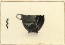 | Description: | Mended from many pieces; about one half, including full profile, preserved. Plain disk foot, high convex walls, single vertical strap handle attached to rim at top. Traces of a second handle implied by crescent break at rim opposite? Vertical or horizontal? Reserved: all of base. Rest covered in a poor streaky black glaze. Many of the pieces gray in color, from fire after breaking? No real parallel in Agora XII, but similar, except for foot, to no. 360. ADDENDA Pattern of streaky glaze indicates that the second handle had to be horizontal. Added red, double line on interior of rim; double line at handle attachment on exterior. (KM 2/99) | |