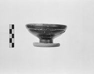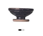 | Description: | Mended from three fragments. Complete except for large chips on rim and foot. Thickened lip, convex body, short cylindrical stem, torus disk foot, rising within in a convex curve. Deep groove below rim. Reserved: bottom of underside, resting surface and outer face of foot. Black glaze, peeled in places. Cf. Agora XII, no. 969-ca. 500 B.C. | |