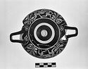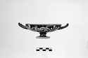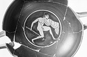 | Description: | Mended from several fragments: almost complete except for sections of rim and chips from bowl. Torus foot, rising underneath, continuous curve to body outside. Broad, shallow bowl, plain lip. Curving, canted horseshoe handles. Reserved: deep interior of bottom, resting surface and outer face of foot, line halfway up body, inside and outside lip, within handles, and circle within forming tondo. Red-figured design outside and inside. Hasty style, and proportions of figures almost cartoon-like. Inside: a youth, nude except for a cloak draped over the left arm and shoulder, moves right, holding a long crooked stick or staff in his right hand. Outside: tendrils coiled beneath handles lead to 5- or 6-leaved palmettes which frame scenes of youths-unarmed except for shields, in combat. On one side a nude youth holding a shield decorated with a dot rosette, advances to the right, his right hand held low as though grasping a spear. To his right, a second youth seen in rear view retreats to the right, holding a shield decorated with a feline (panther?) and wearing a cloth of some sort from waist to just above knees. His right hand, too, is bent and held low. On the other side a nude youth, holding an undecorated shield and his right arm held high, advances to right, toward a second youth seen in three-quarter frontal view who is retreating right, holding a shield decorated with an animal, apparently a horse, possibly intended to be a panther. Second youth is also nude and also holds his right arm high, as though grasping a spear. Good black glaze, Attic clay. Cf. Agora XII, no. 432, 500-480 B.C. | |