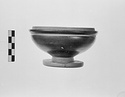| Description: | Mended from five fragments complete; lid missing. Spreading ring foot on short fat stem. Steep wall, slightly flaring lip, flat on top, set off from body by incised groove. Flange to hold lid. Reserved: bottom of underside resting surface and outside of foot, incised grooves at bottom and top of body, top of flange. Added red: stem of foot, outer face of flange. Black glaze slightly misfired within and underside of foot. Cf. Agora XII, nos. 1268-1269; 500-480 B.C. | |