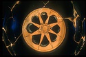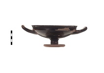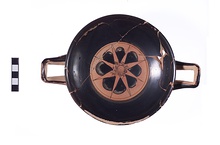 Cup with concave lip. Torus foot, rising within; raised fillet at juncture of stem and foot, offset by scraped grooves. Red-figure decoration within: an eight-spoked wheel, the spokes coming to a point as they reach the rim. Cross-hatched lines near base of spokes reflect binding of spokes to axle and/or each other. Spokes in two overlapping planes of four spokes each. Edge thick, curving to thicken more at juncture with spokes. Reserved: within handle, resting surface, bottom of cone within and outside of foot. Black glaze, peeling somewhat on exterior. Indistinct traces of letters between spokes: