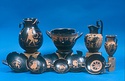 Torus disk foot, rising within. Two scraped grooves at juncture of foot and stem. Reserved: center of underside, resting surface, face of foot, inside of handles and handle panels.
