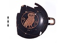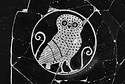 Decoration within: Tondo of reserved line, with owl and tendrils within. Owl stands right, spotted except for wing feathers. Simple tendrils on either side. Ghost image of curving leaves and letters discernable to right of owl: