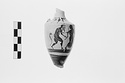 | Description: | Body of small lekythos preserved, missing foot, handle and mouth. Painted scene of front only: maenad between two satyrs. She moves right, looking back over her shoulder at satyr grasping her arm. Second satyr approaches from right. Branches in background. Use of incision, no added red or white survives. Rays on shoulder. Class of Athens 581, ii, cf. Agora XXIII, nos. 1079-1087, early 5th. B.C. | |