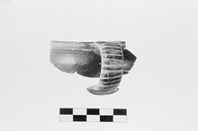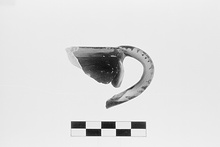 | Description: | Two joining fragments, preserving portion of rim and one handle. Exterior and interior painted except for reserved band at rim inside and out. Handle barred. Good lustrous black paint. Clay close to 5YR 7/6-6/6. Shape as P 32429, P 16571 and P 16572. | |