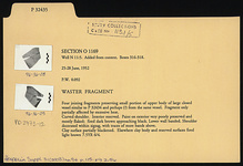| Description: | Four joining fragments preserving small portion of upper body of large closed vessel similar to P 32434 and perhaps (?) from the same vessel. Fragment only partially affected by excessive heat. Curved shoulder. Interior reserved. Paint on exterior very poorly preserved and mostly flaked; fired dark brown approaching black. Lower wall banded. Shoulder decorated within zigzag, with traces of more bands above. Clay surface partially blackened. Elsewhere clay body and reserved surfaces fired light brown 7.5YR 6/4. | |