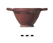 Flaring ring foot, bell handles. Reserved: underside of foot, with two glazed rings and central dot, outer face of foot, and some of zone above foot. Band below handles.
