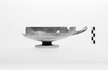 | Description: | About half preserved, mended from six pieces. Disk foot, stem offset from foot by two scraped grooves. Reserved: center of underside, resting surface, outer face of foot, inner part of handle and handle panel. Fired a cloudy gray with some red. Identical to P 32476. Cf. Agora XII, no. 419, ca. 500 B.C. | |