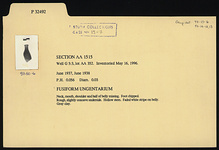 | Description: | Neck, mouth, shoulder and half of belly missing. Fusiform shape. Foot chipped. Rough, slightly concave underside. Hollow stem. Faded white stripe on belly. Gray clay. | |