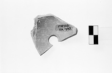 | Description: | Single fragment preserving portion of test-piece, including three-quarters of draw-hole and parts of three edges. Piece probably cut from lower body of open vessel. Paint on interior most fired red; red-black on exterior. Painted solid on both sides. | |