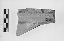 Description:   Two joining rim fragments of a large open vessel, glazed within and banded on the outside. Just below the rim is inscribed the name of the Themistokles, turning at a right- angle along the break.