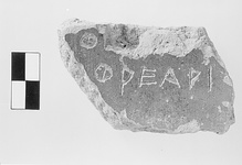 Description:   Single wall fragment, broken all around. Fragment from the wall of a large open vessel (bowl ?), glazed red on the inside only; the name and demotic of Themistokles inscribed within: <graphic>