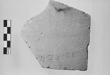| Description: | Single fragment, broken all around. From wall of a large coarse-ware vessel, with wheel marks on interior and matte buff wash on exterior. On one end inscribed part of the name of Themistokles: <graphic> Light pinkish-orange, medium-grained clay with small black and white inclusions. Cf. Agora XXV, pp. 102-132. | |