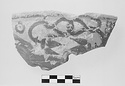 Description:   Single fragment (of large base?) preserving part of resting surface. Base(?) unglazed on the interior and decorated on the exterior in reddish-orange glaze: horizontal band below knotted stems terminating in facing double buds, with a dotted circle on the right and larger red patches above and on the left. Outlines partly incised. On the interior are inscribed the name and demotic of Themistokles: