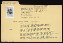 | Description: | From the wall of a large closed vase. Part of two friezes preserved, separated by a double horizontal line. On the upper frieze, the feet and lower skirts of two draped figures right; the figure to the right, female (remains of white on the feet). White also for dots on the garments of both figures and a red stripe a on the woman's. In the lower frieze, the back part of a lion or panther, right. White belly stripe. Rather coarse pinkish buff clay, unglazed on the inside. Orange wash on the outside. | |