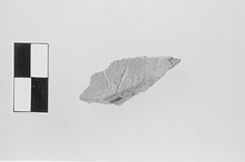 | Description: | Single fragment broken all around. Unglazed thin wall fragment. On the interior are preserved two scratches, possibly part of an inscription: <graphic> Pinkish tan medium-grained clay with white and gray inclusions. | |