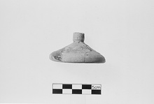 | Description: | Four joining fragments (a) and a non-joining fragment (b) preserve half of pyre lekanis lid with complete profile. Glaze dull and very worn. Sloping wall almost vertical at rim. Roughly cylindrical knob with flat top. Fine pinkish-buff clay; originally glazed black all over. Cf. Agora XXIX, no. 1453, 300-270 B.C. | |