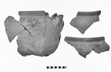 | Description: | Three non-joining rim and body fragments: a) Mended from nine fragments preserving rim, body, and stumps of one handle. b) Two joining rim fragments. c) Two joining rim fragments. Large baggy body, short sloping shoulder. Groove at junction with up-turned projecting rim. Interior of rim with wide groove and sharp ridge for lid. Large horizontal handle, round in section, at junction of shoulder and body. Very coarse, heavy fabric. Gray core with large white inclusions and a little mica. Surface red-brown with carbon. Second example from same deposit. | |