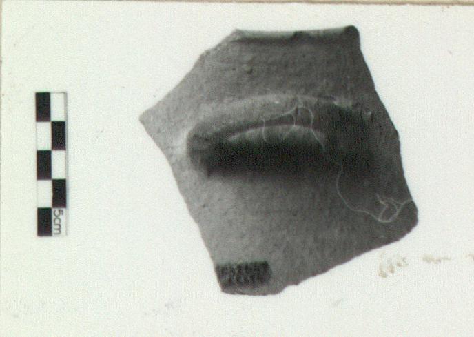 | Description: | Single fragment of body, rim and handle. Baggy body with slightly outward-flaring neck. Out-turned rim with rounded lip. Upturned horizontal handle, round in section, at shoulder. Very coarse cooking ware fabric; gray clay with many large and small white, pink, gray inclusions, little mica. Buff-pink exterior smoother than interior. | |