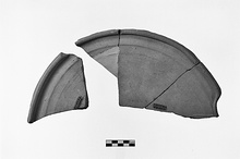 | Description: | Two non-joining fragments preserving about one-third of circumference. Flat disk shape, coarsely finished underneath. Top surface with wheel marks, wide groove at edge, rolled rim. Portion of concave notch in rim. Pink-buff clay with large red and white inclusions. | |
