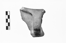 Description:   One fragment preserving part of rim, handle and shoulder. Slightly convex shoulder narrowing to rounded projecting rim with narrow, rounded groove on top surface; thick strap handle from junction of shoulder and body to rim.