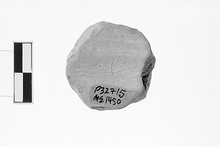 Description:   Roughly circular chipped clay disk "counter" fashioned from the body of a closed vessel. Slip on exterior very worn but approaching off white. Exterior slipped; traces of painted horizontal band near break on one side. Paint as preserved fired dark brown-black.