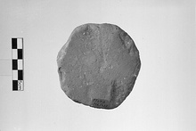 | Description: | Roughly circular large chipped clay disk "counter" fashioned from the body of a large coarseware vessel, almost certainly a pithos. Exterior surface slightly better finished than interior. Clay on interior surface close to light red 2.5 YR 6/6; closer to light brown 7.5 YR 6/4 on exterior surface. | |