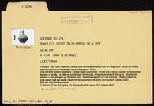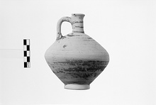 | Description: | Complete. One body fragment, joining neck and handle mended from two fragments. About two-thirds of the foot preserved (remainder restored in plaster). Worn. Ring foot with concave moulding. Central nipple underneath. Ovoid body (almost angular) with maximun diameter in middle. Air hole on shoulder just below neck. Straight narrow neck, flaring lip. Strap handle attached at mid-shoulder and just below rim. Painted band at join of foot and body. Multiple bands on neck, upper body and handle (paint very poorly preserved: lower body possibly painted solid). Buff clay with thin brown glaze. Cf. Perati 177 and 213 (grave 12); Kerameikos 505 (grave 92); Salamis 3620 . | |
